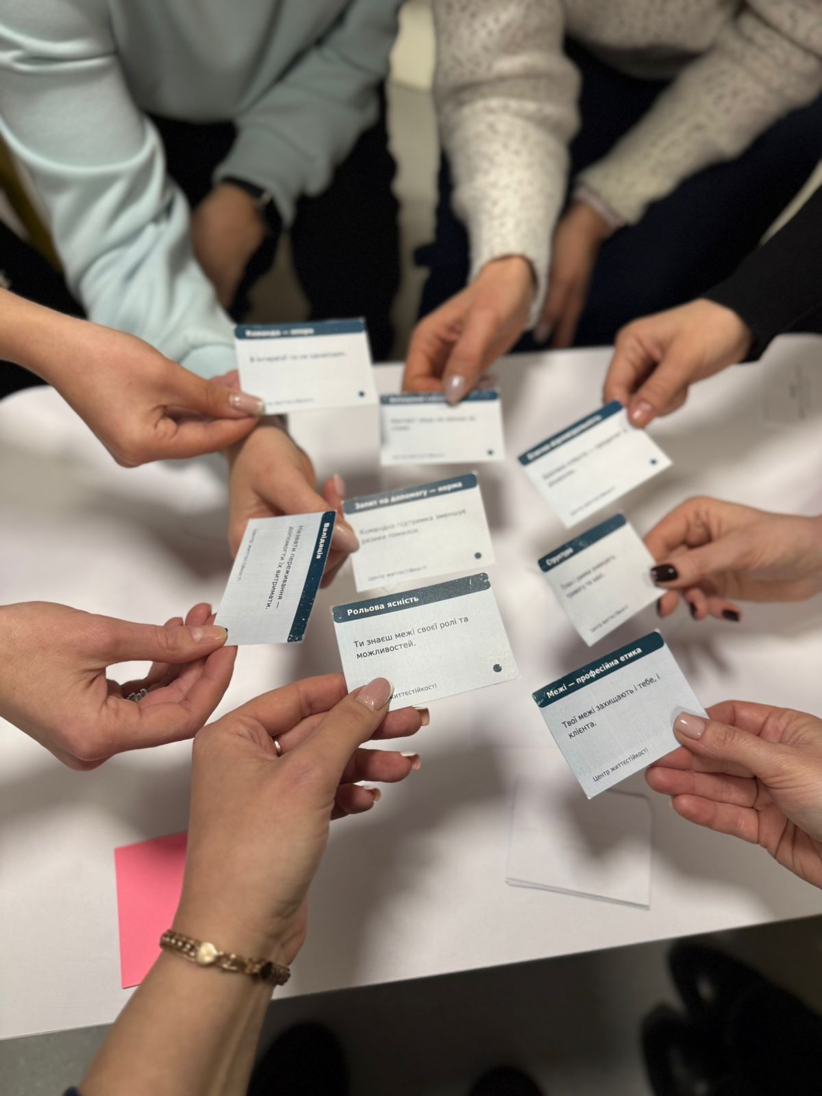 Метафоричні карти як інструмент ресурсності. Використання спеціальних асоціативних висловів та зображень допомогло учасникам поглянути на робочі ситуації під іншим кутом. Це дозволило змістити фокус із проблем на внутрішній ресурс та пошук нових рішень.