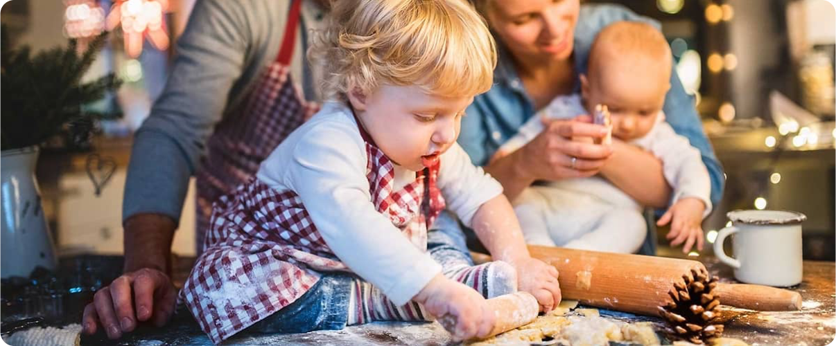 Навіть менші діти зазвичай можуть допомагати розбивати яйця, зважувати та змішувати інгредієнти, вирізати печиво з розкачаного тіста, змащувати печиво глазур’ю або яєчним жовтком або прикрашати печиво.